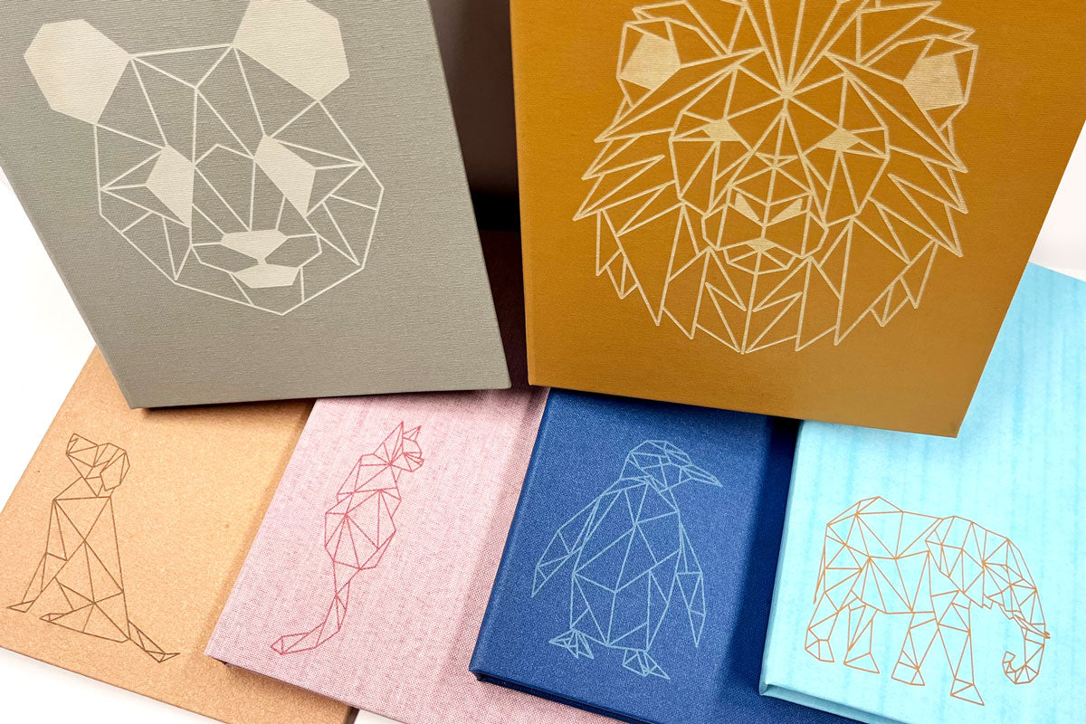 Präzise gravierte Polygon-Tiere treffen auf vielfältige Kombinationsmöglichkeiten: Coverfarben, Gummis und Verschlussbänder in vielen Varianten. So entsteht ein Notizbuch, das perfekt zu dir passt.